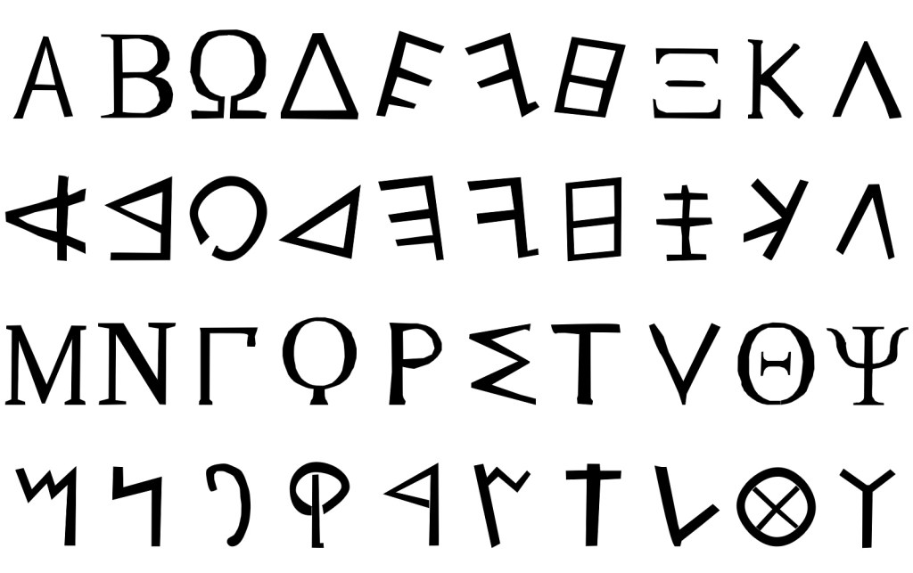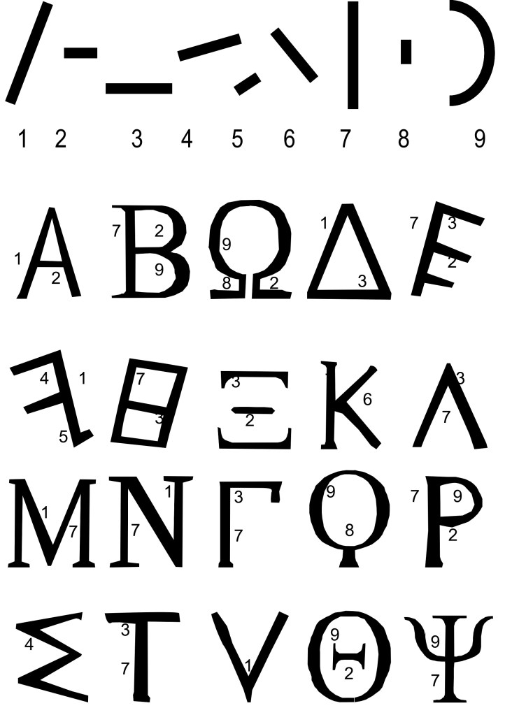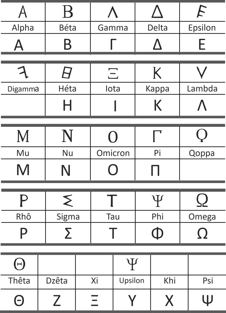Aux vingt lettres que nous connaissons dans l’alphabet Latin, la comparaison se fait avec les lettres du Grec archaïque.