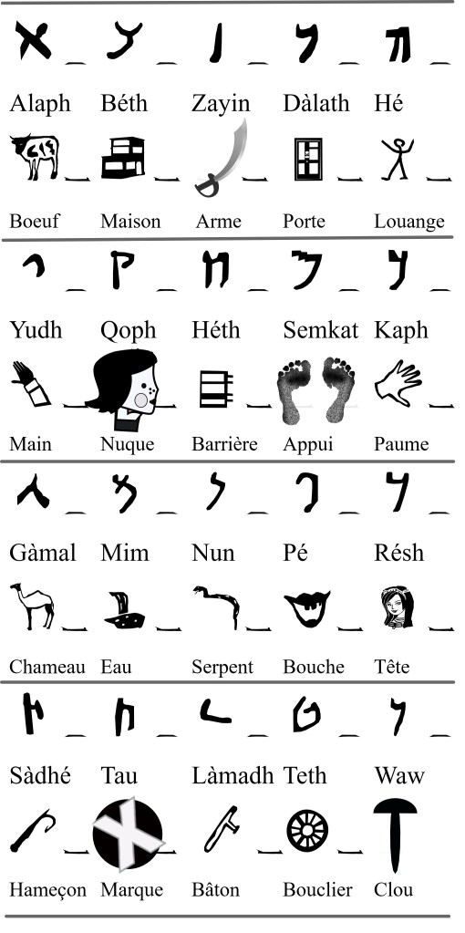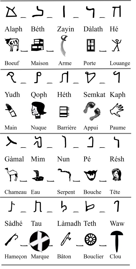 Toutefois deux cas attirent l’attention, celui des « Yuth » (sixièmes caractère en lignes 1 et 2) graphiquement très proches, cette graphie deviendra le Digamma en Grec.