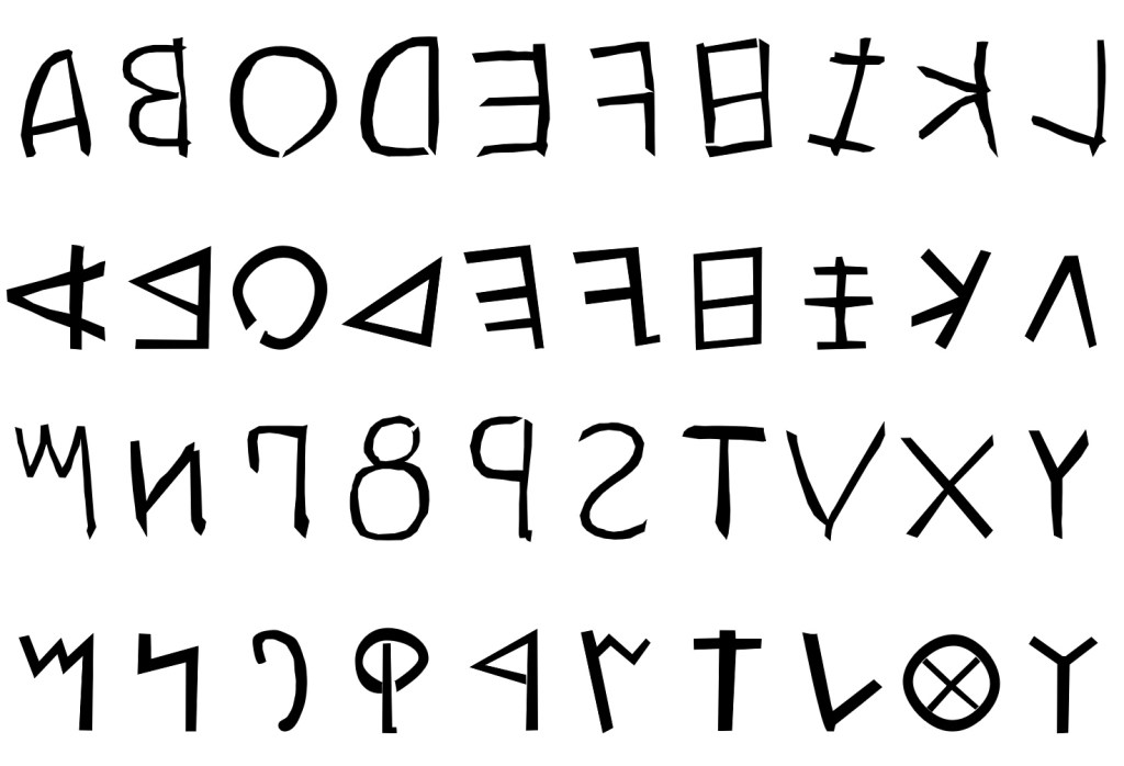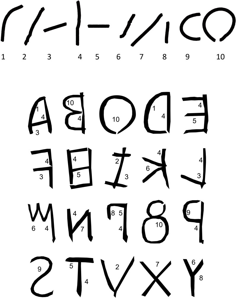 Nous ne disposons que de quelques exemples de leur écriture, un niveau de rareté suspect. La comparaison avec le Latin archaïque est troublante puisque l’alphabet semble avoir été inversé.