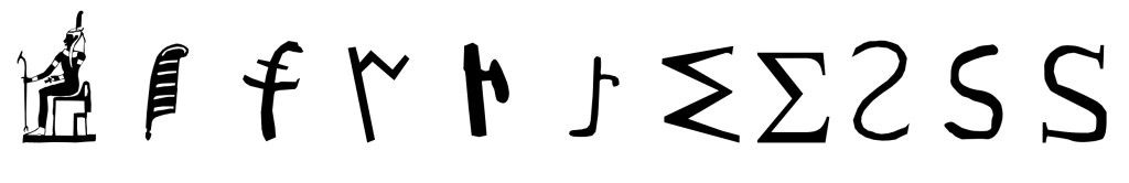 En hiéroglyphique, ce symbole va progressivement dériver depuis la plume d’autruche, sa symbolique en Haute Égypte vers la branche de papyrus s, transition ultérieure en Basse-Egypte.