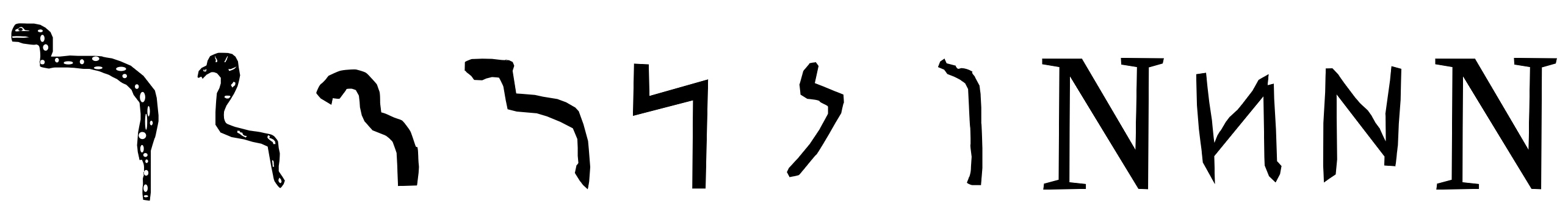 Ils nous ont aimablement indiqué que leur Nun était la représentation d’un serpent, ce qui reste vrai chez les Araméens, le dessin étant un peu plus oblique et les Nabatéens qui l’aplatissent n, comme si le serpent était suspendu par la tête. La graphie n’évolue plus ensuite, ni le nom de la lettre, Nu en Grec et simple N en latin classique. On note l’inversion du sens d’écriture entre l’Étrusque N, proche du Phénicien et le Latin, qui reprend le sens Grec.