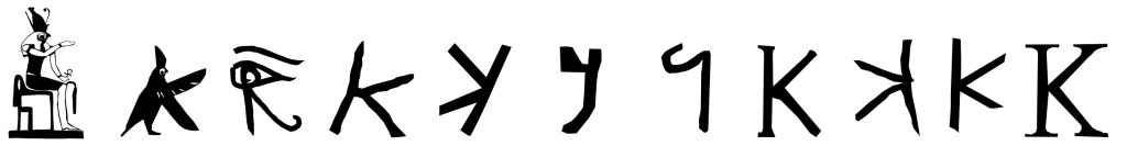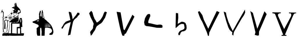Sa lettre symbole s’inspire de sa morphologie faciale. Elle dérive en une grande simplification depuis la frimousse « d’Animal Séthien », figuration des hostiles, voire des infernaux des temps anciens.