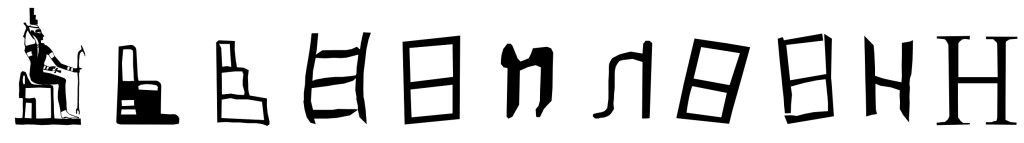 Son emblème est facile à suivre au cours des 4 500 ans d’évolution des lettres. À partir du Proto-Cananéen, le Phénicien l’écrit Heth, considérant son symbole comme celui d’un mur peut-être parce que les représentations majestueuses d’Isis la font s’assoir sur un trône en pierres.