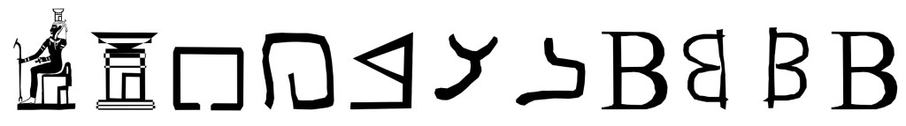 En Grec archaïque et classique le nom est pratiquement identique à celui du Phénicien, béta alors que la forme évolue par la fermeture de la partie basse. Ce qui sera aussi le cas de l’Étrusque qui est tournée comme la graphie Phénicienne, ce qui sera inversé en Latin pour se stabiliser