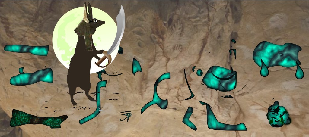En linéaire son identifiant évoque son museau et ses oreilles. C’est la partie haute des sceptres présentés comme signe royal d’autorité ou comme arme, ce qui est souvent la même chose.