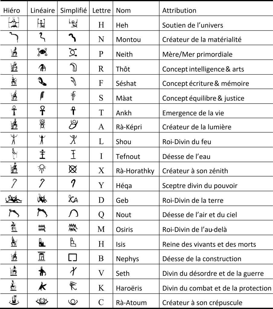 Il existe plusieurs récits primordiaux de la mystique Egyptienne, ils correspondent à des villes, des périodes et des dynasties différentes, qui avaient sans doute leurs motivations propres tout en utilisant les mêmes « éléments de base ». Après avoir trouvé les racines hiéroglyphiques de chaque lettre et avoir constaté qu’elles correspondaient toutes à une divinité ou un symbole divins, nous proposons une genèse unifiée, telle un enseignement clair et simple de la mystique Egyptienne, se concentrant sur les divinités principales et ne tenant pas compte de leurs avatars, doublons et surgeons dont le nombre dépasse les 3000.
