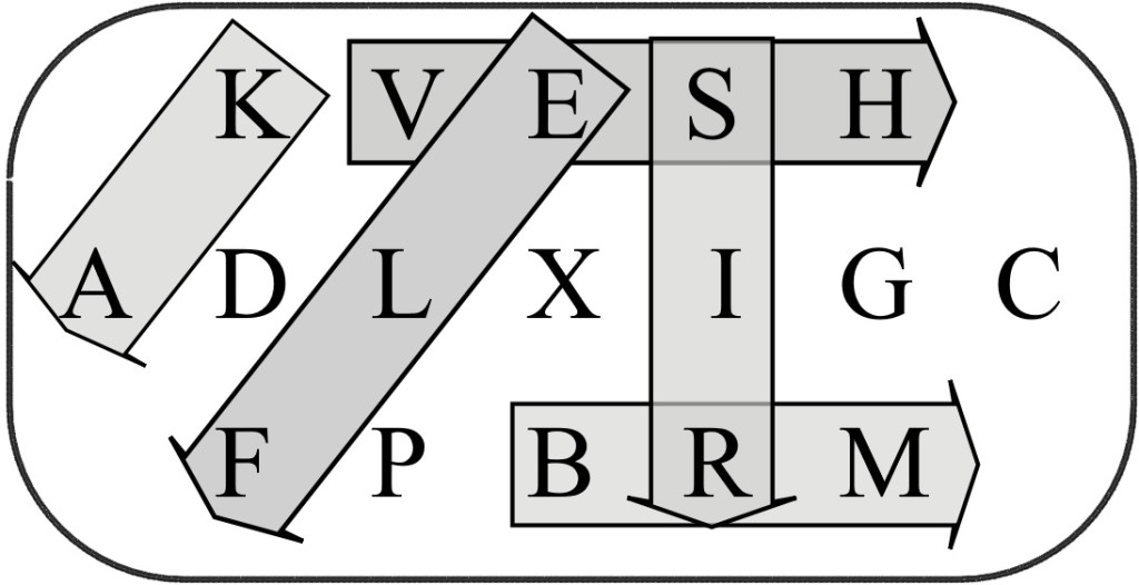 Nous observons qu’avec 17 caractères, nous sommes en déficit de 9 lettres par rapport à l’alphabet usuel. Point de O, de U, ni de Y. Pas non plus de J, N, Q, T, absence de W et nous n’avons pas de Z !