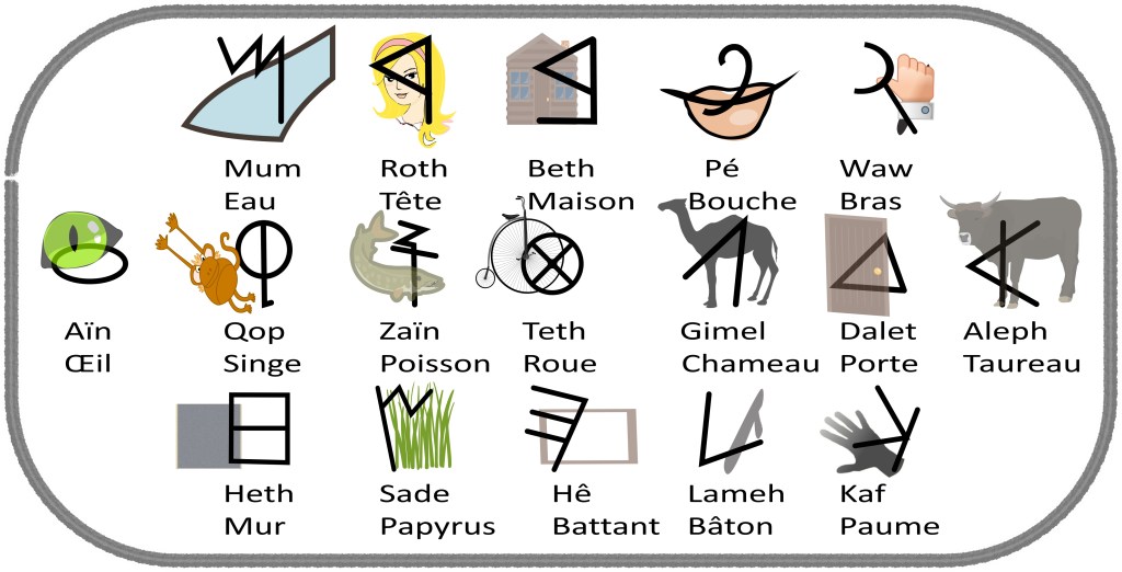Chacune de leurs lettres est dotée d’une triple signification : graphique, pratique et symbolique. Pour les Phéniciens, un signe représente l’élément de base à assembler. Il est un objet ou un animal, une action, ou une intention.