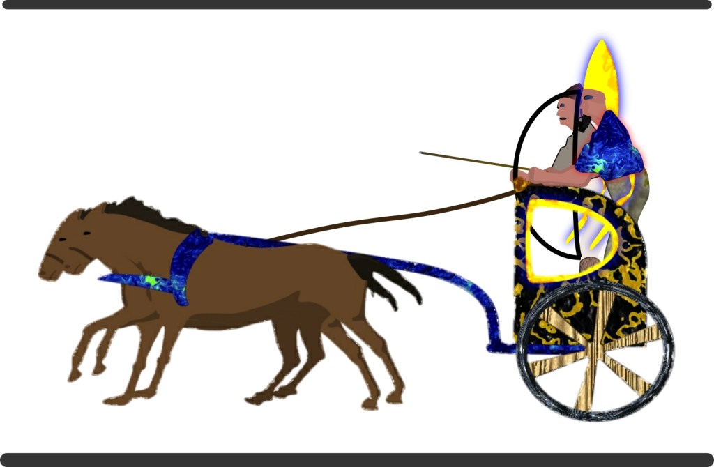 Par la contemplation des fresques, nous savons que Ramsès II mène ses troupes depuis son char de combat, ou aime à le faire croire. Grand communiquant s’il en fut, il se montre capable de conduire ses chevaux sans les mains, les rênes passées autour de la taille. Dans la pratique, un Roi qui risquait sa vie se faisait accompagner par un aurige chargé de guider l’ensemble et d’intervenir en protection.